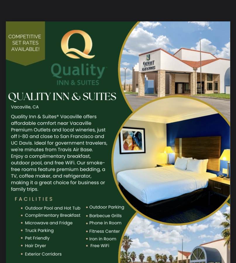 Quality Inn & Suites® Vacaville provides affordable comfort just moments from the Vacaville Premium Outlets, Jelly Belly Headquarters, Lagoon Valley Park and local wineries. We're just off Interstate 80 within easy reach of San Francisco, University of California Davis and Sacramento. For Government travelers we are minutes away from Travis Air Base making it ideal for quality and rates!