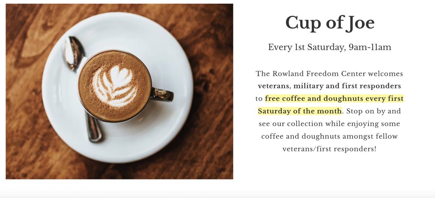 The Rowland Freedom Center welcomes veterans, military and first responders to free coffee and doughnuts every first Saturday of the month. Stop on by and see our collection while enjoying some coffee and doughnuts amongst fellow veterans/first responders!