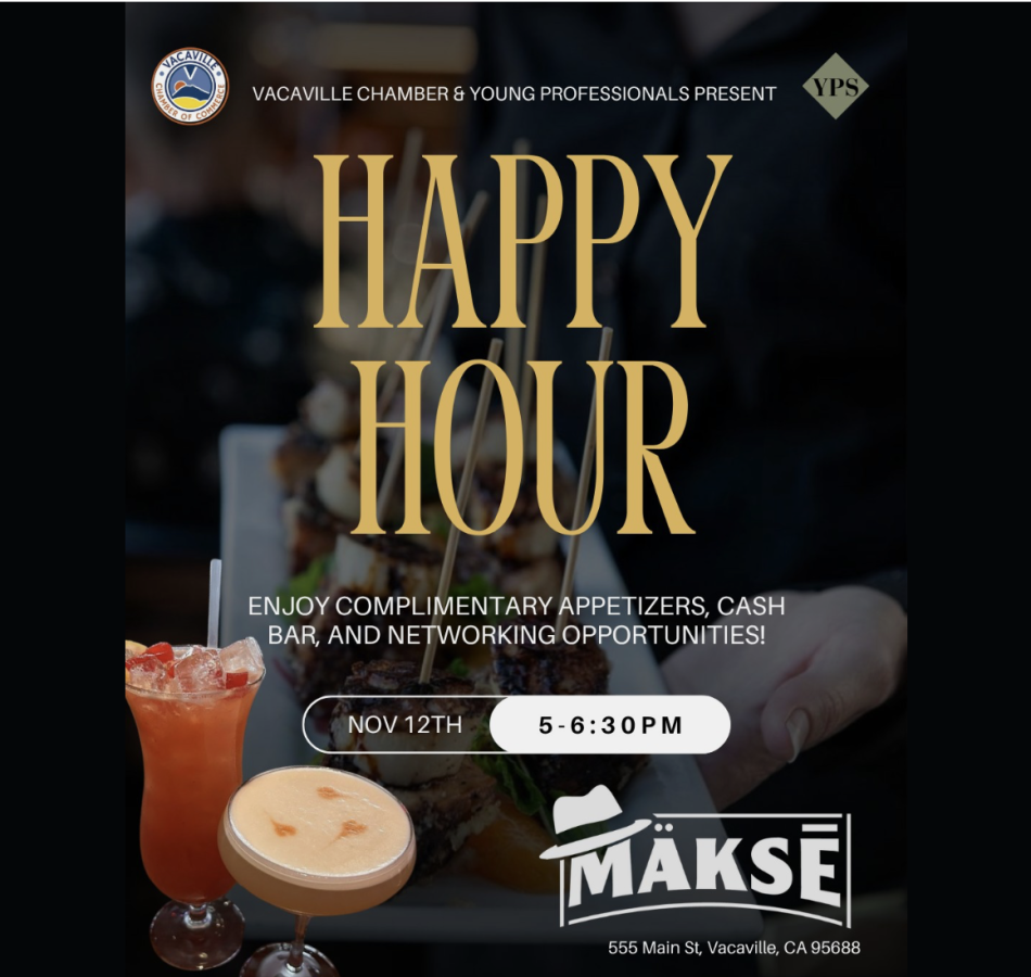 Join us for Happy Hour at Mäksē Restaurant, Vacaville. Whether you’re new to networking or a seasoned pro, this is the perfect place to connect. Join us at Mäksē Restaurant for a casual evening filled with great appetizers, easy conversation, and new connections.