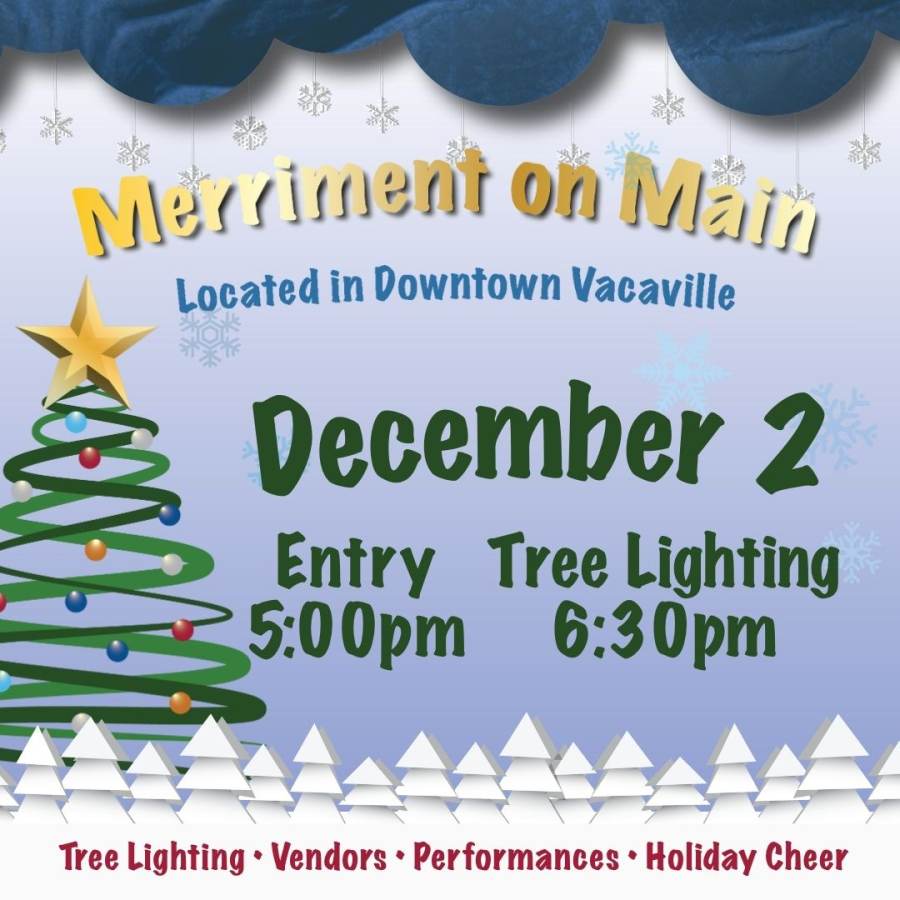 Join us the Tuesday after Thanksgiving at 5:00 PM for a festive evening full of cheer in Vacaville's downtown at Merriment on Main. Vendors will line Main Street offering free sweets and goodies, and performers and crowd entertainers will captivate even the smallest kiddies. With eager anticipation, the beautifully adorned fifty foot tree will be lit promptly at 6:30 PM. Thousands of event goers will gather to experience the holiday extravaganza with music, lights, and plenty of holiday spirit. Mark your calendars, ready your ride, and get ready for a jolly good time!