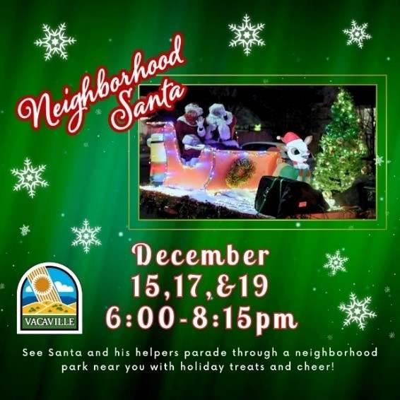 The City of Vacaville, through Vacaville Parks and Recreation, will be hosting the fifth annual Neighborhood Santa, a FREE parade that will pass through 15 neighborhood parks. The event is scheduled for Monday, December 15, Wednesday, December 17, and Friday, December 19, from 6:00 to 8:15 p.m. m.