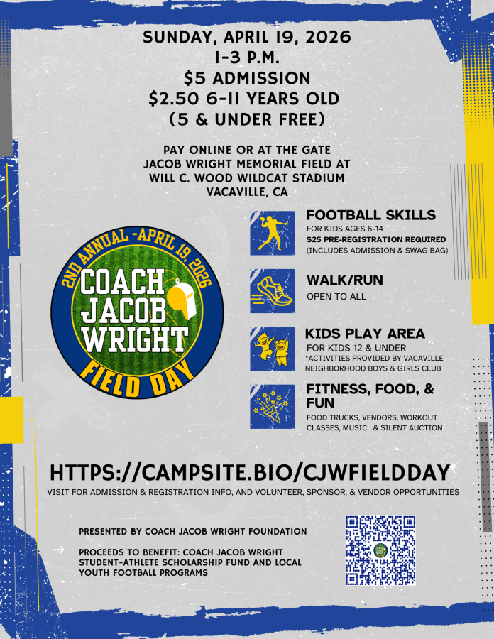 Join us for the Second Annual Coach Jacob Wright Field Day Sunday, April 19, 2026 1-3 p.m. at the Wildcat Stadium. A Football Skills Camp is at the heart of this event but there's something for everyone in the family; from it's kid's zone with activities provided by the Vacaville Neighborhood Boys & Girls Club, and a jumpy obstacle course to the workout classes like zumba, yoga and Tahitian dance. There'll even be food trucks, a silent auction, community outreach, a Coach Wright exhibit and so much more!!