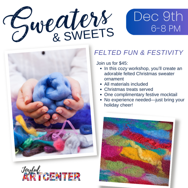 Get in the holiday spirit with Joyful Art Center! In this cozy workshop, you’ll create an adorable felted Christmas sweater ornament—the perfect handmade addition to your tree or a sweet gift for someone special.